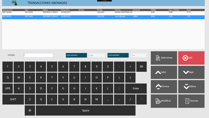 d)Botón Seleccionar: retoma una transacción con el fin de que permita realizar un nuevo abono o ser facturada. Esta acción nos llevará a la ventana principal del punto de ventas.